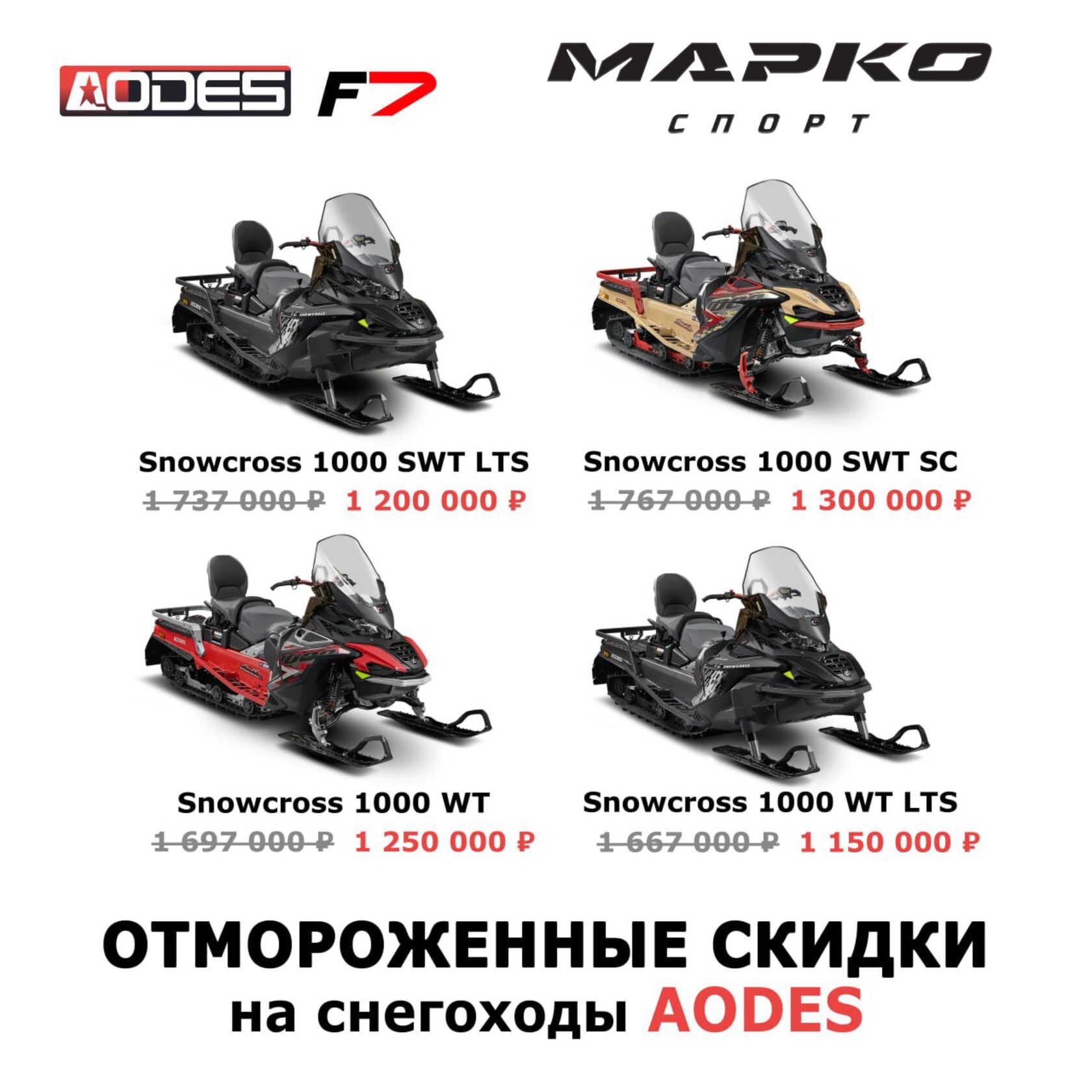 Зима в самом разгаре, а мы решили «заморозить» цены на экстремально низком уровне. Встречайте акцию «Отмороженные скидки» на всю линейку снегоходов AODES Snowcross 1000 Ваша выгода — до 537 000 рублей!*